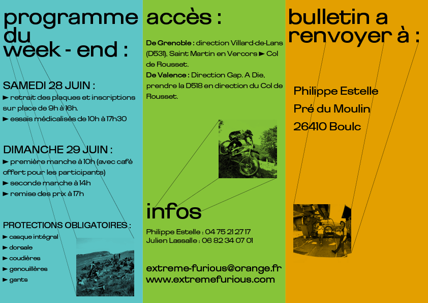 Cette année, il existe un classement Master 3 .(+ 50ans).C'est intéressant pour moi (53 ans) dans la mesure où il y aurait un dizaine d'inscrits... mais si l'on est que 2- 3 je préfère concourrir avec les masters 2 pour l'émulation. Je soupçonne les organisateurs d'avoir créer ce classement pour éviter de se mesurer à" l'ancêtre"... On a les genoux qui tremblent , hein ! Je suis connu dans les compèts, j'ai mis une sonnette de vélo ,(gling-gling) quand les pilotes l'entendent dans leur dos, ils se jettent dans le premier fossé qu'ils trouvent sur le bas côté ! Une info, car on a une taupe infiltée dans l'organisation : ils ont fait une partie "trial" à la fin , je n'en sais pas plus... Je vois la taupe, ce WE je vais essayer de la cuisiner sur le sujet ! Ils prennent les inscriptions au dernier moment le samedi matin, c'est leur politique... Début des inscriptions samedi 9 h...16 h. Début des essais : 10h