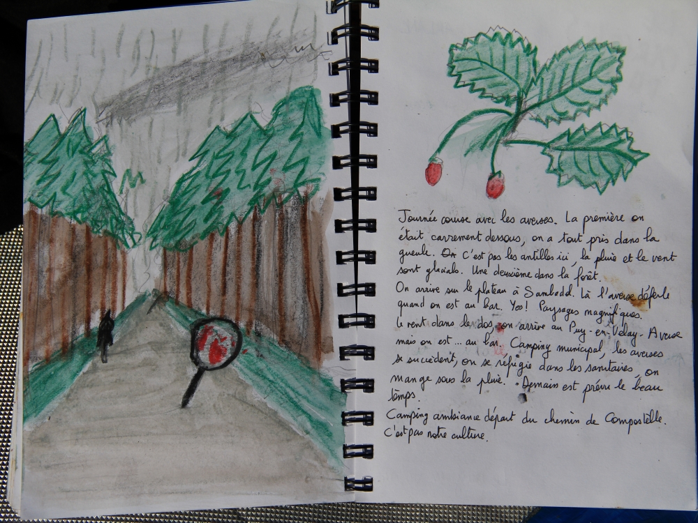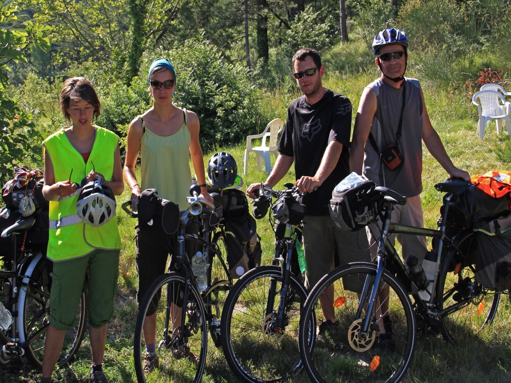 2 gars, 2filles, je les ai rencontrés à Mezilhac, des cyclo- randonneurs avec tout le barda, tentes, casseroles... C'est vrai que ça inspire la sympathie ; je les "branche" . D'où ils viennent , où ils vont ? ...