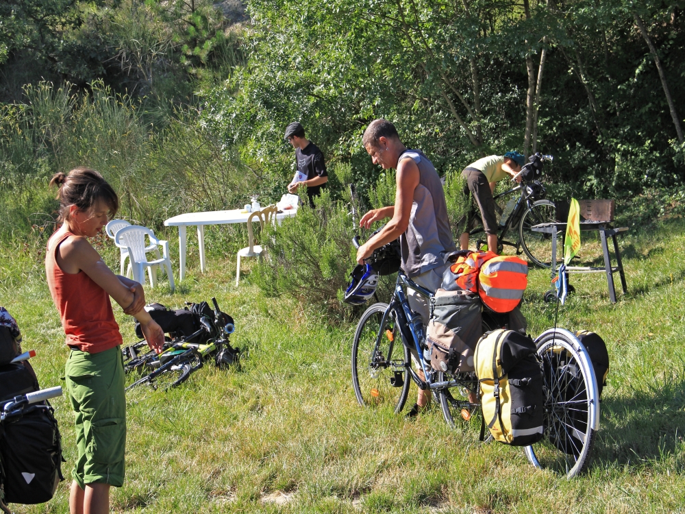2 gars, 2filles, je les ai rencontrés à Mezilhac, des cyclo- randonneurs avec tout le barda, tentes, casseroles... C'est vrai que ça inspire la sympathie ; je les "branche" . D'où ils viennent , où ils vont ? ...