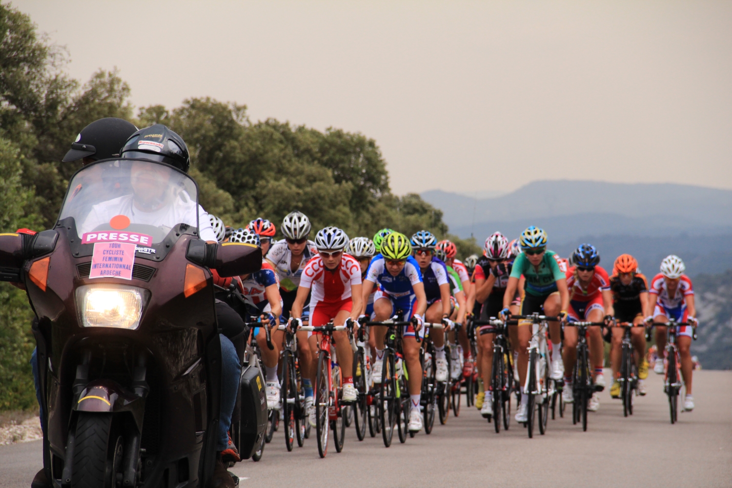 Bien, je peux mourir tranquille , j'ai vu , photographié , filmé, quelque chose de magnifique . Moi qui aime le vélo , les routes , les paysages d'Ardèche , et les jolies filles , l 'organisation m'a mis sur une moto pour remplacer Aurore , photographe officielle pendant la semaine, mais absente ce samedi. Mon pilote-moto un jeune, beau garçon, l'a "trimballée" toute la semaine , et a noué , je pense, quelque relation plus intime, on est dans le doute ! (Mais cela ne nous regarde pas) .Toujours est-il que l'on a beaucoup parlé d'elle , mon pilote au grand cœur a ,je crois un peu "craqué" sur la belle ...